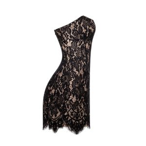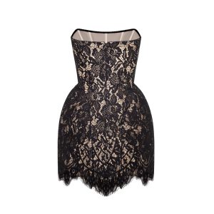 Figure-hugging lace short dress crafted from delicate black lace over a nude base. Soft yet structured, it traces the body’s natural lines and accentuates the waist and hips. The corset-style bodice ensures a flawless fit, while the silhouette gently contours to the figure, adapting to various proportions.