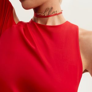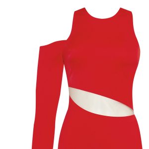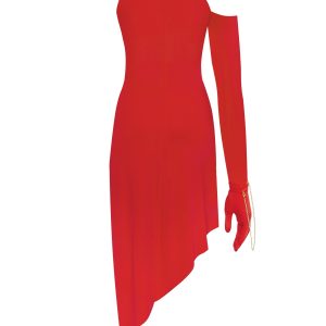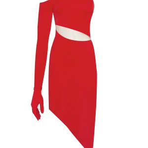 Marvelous midi-length dress designed to be the center of attention. Made from red lycra, the style has a boat neckline, a sheer insert under the bust, and a fitted asymmetric skirt. The dress comes with a detachable long-sleeved red glove.