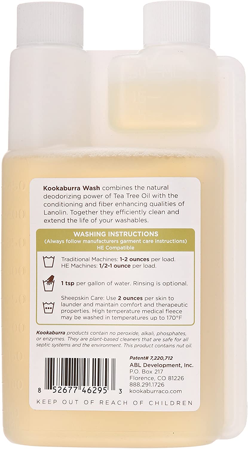 How to: Machine wash – 1-2 oz in a “traditional”, ? – 1 oz in a HE washer. Kookaburra is effective at any temperature. With Kookaburra concentrate no additional softeners are required Hand wash – 1tsp (1/6th oz) in 1-2 gallons warm water. Add Wash to water immerse garment making sure there is complete saturation. Rinsing is optional. Sheepskin products – 2oz per skin to launder and maintain comfort and therapeutic properties.