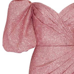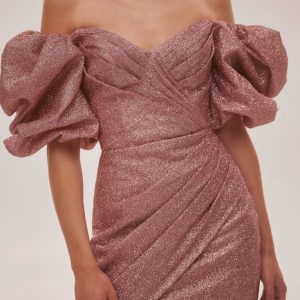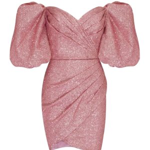Adorable mini dress in shimmery ivory fabric. Features a heart-shaped wrapped bodice, off-the-shoulder puffed flashlight 3/4 doll sleeves that add playfulness to the look, and a lace-up closure on the back.