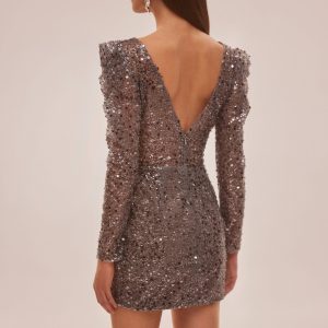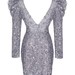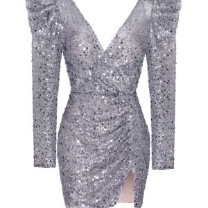 Eye-catching long-sleeve mini dress in silver metallic. The dress is covered in sequins and features a fitted wrapped silhouette, a V-neckline, a deep open V-back, some cute ruffles on the shoulders, and a tiny elegant thigh slit.