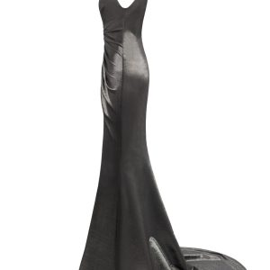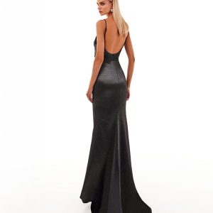 Graphite gray mermaid-style dress on spaghetti straps. Featuring a plunging neckline, an open back, soft gathers through the waist and hips, a floor-length maxi skirt with a daring front slit, and a short train.