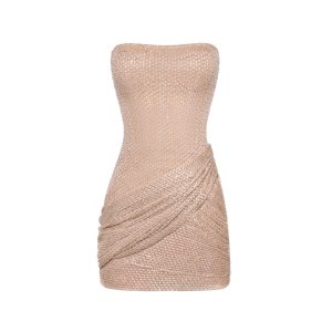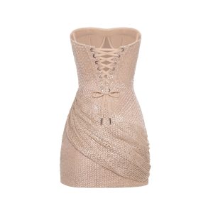 Lace beige short dress that sculpts an hourglass silhouette with precise draping around the hips, creating the illusion of fuller curves. Fully hand-embroidered with sequins, it catches the light beautifully — the perfect piece to shine through your holiday nights.