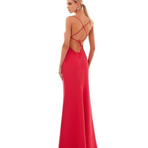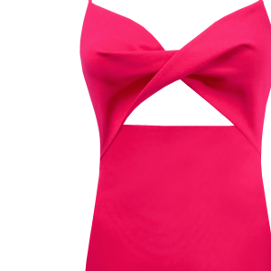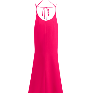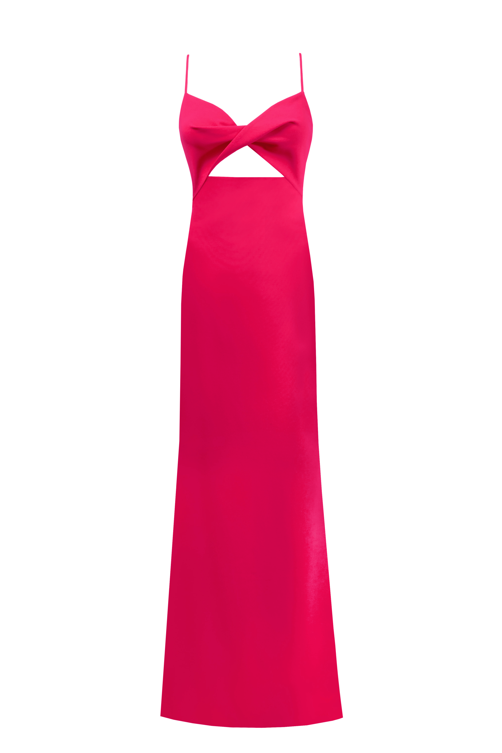 Showy maxi fuchsia dress on spaghetti straps with a twisted cutout bodice, an open back with criss-cross straps, and a maxi-length skirt.